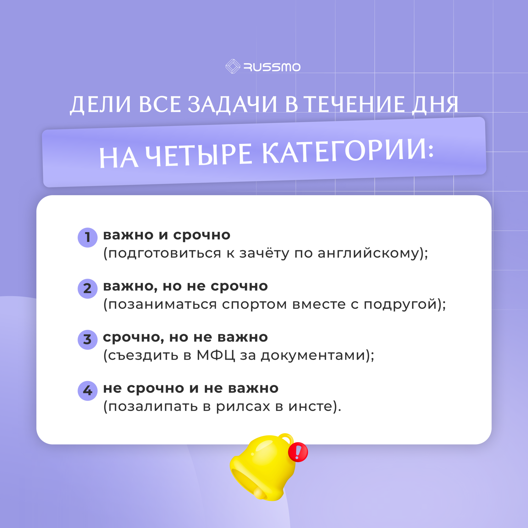 Каждое утро перед началом дня дели подобным образом все задачи на день, так ты сразу будешь видеть, на что должен быть направлен твой главный фокус в течение дня, а что можно будет сделать чуть позже.