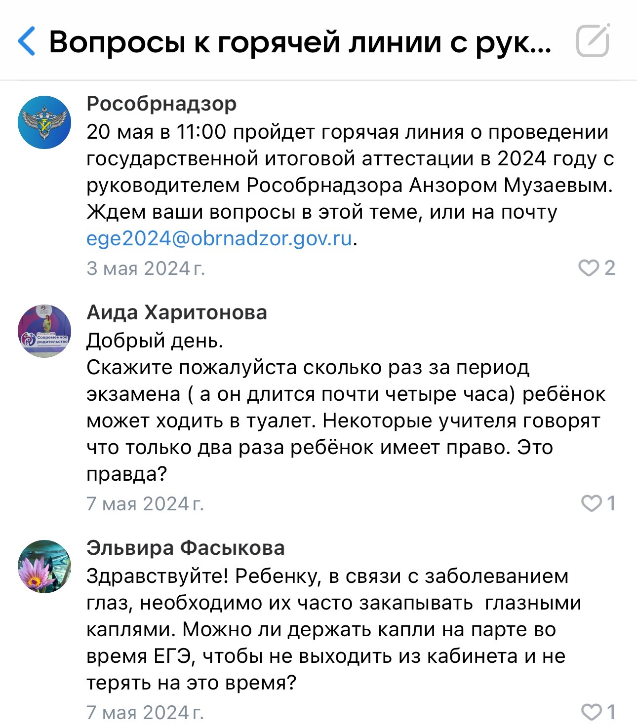 Примерно за 20 дней до проведения онлайн-трансляции в официальном сообществе Рособрнадзора во «ВКонтакте» появляется обсуждение, куда можно написать свой вопрос. Кроме того, обычно за это же время создаётся и публикуется электронная почта для вопросов горячей линии.