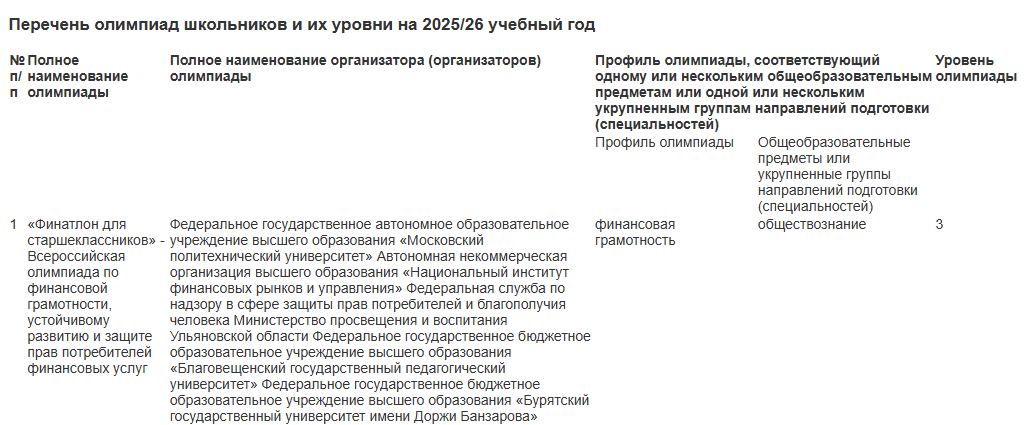 В вышеупомянутом перечне олимпиад содержится исчерпывающая информация по поводу всех олимпиад, дающих «бонусы» при поступлении. Перечень выстроен следующим образом: указано наименование, профиль и уровень олимпиады.