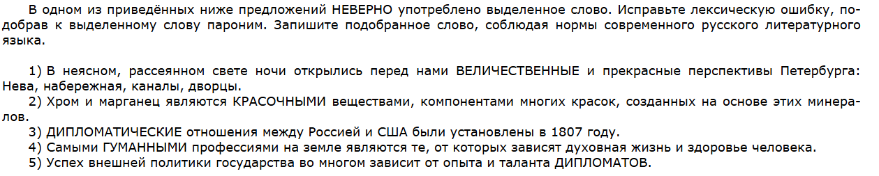 Даны пять предложений, в каждом из которых большими буквами выделено слово. Задача — определить, верно ли употреблено выделенное слово, и если нет, то заменить его на правильный пароним.