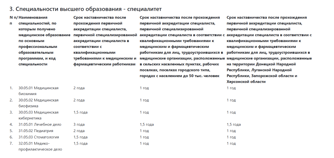 Например, согласно проекту приказа, выпускники педиатрии обязаны отработать после аккредитации два года, а выпускники-стоматологи, трудоустроившиеся в медицинские организации, расположенные в сельских населённых пунктах с населением до 50 тысяч человек, — один год. Однако полностью на этот перечень опираться ещё нельзя, он находится в процессе доработки.